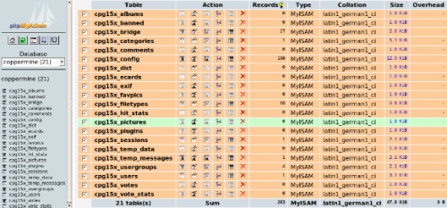 <?php // add the mysql connection stuff here DROP TABLE `cpg15x_albums`, `cpg15x_banned`, `cpg15x_bridge`, `cpg15x_categories`, `cpg15x_comments`, `cpg15x_config`, `cpg15x_dict`, `cpg15x_ecards`, `cpg15x_exif`, `cpg15x_favpics`, `cpg15x_filetypes`, `cpg15x_hit_stats`, `cpg15x_pictures`, `cpg15x_plugins`, `cpg15x_sessions`, `cpg15x_temp_data`, `cpg15x_temp_messages`, `cpg15x_usergroups`, `cpg15x_users`, `cpg15x_votes`, `cpg15x_vote_stats`; ?>safe the file as "droptables.php" and upload that file (using your FTP app) to the folder your coppermine gallery resides in. Then run the file you just uploaded in your browser by going to the URL http://yourdomain.tld/your_coppermine_folder/droptables.php