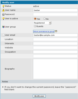 Please note that this screen (as well as the rest of Coppermine's user management) will not be available if you have enabled bridging, because then the user management of the application you have bridged with (e.g. your BBS) kicks in and handles everything related to user management.